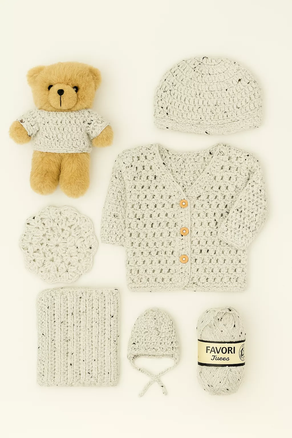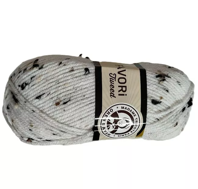 Příze FAVORI TWEED BÍLÁ MELÍR je elegantní akrylová příze s jemným tweedovým efektem – bílé vlákno je protkáno decentními černými a šedými nopky, které dodávají úpletům rustikální charakter. Skvěle se hodí na dámské svetry, šály, čepice, rukavice i dekorační doplňky.